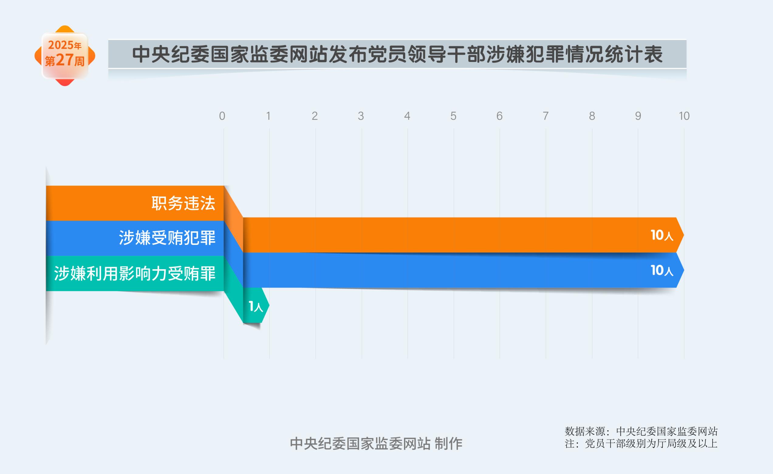 中央纪委国家监委网站2025年第27周发布的党纪政务处分信息中,所有被处分党员领导干部均构成严重职务违法并涉嫌受贿犯罪。有1人还涉嫌利用影响力受贿犯罪。