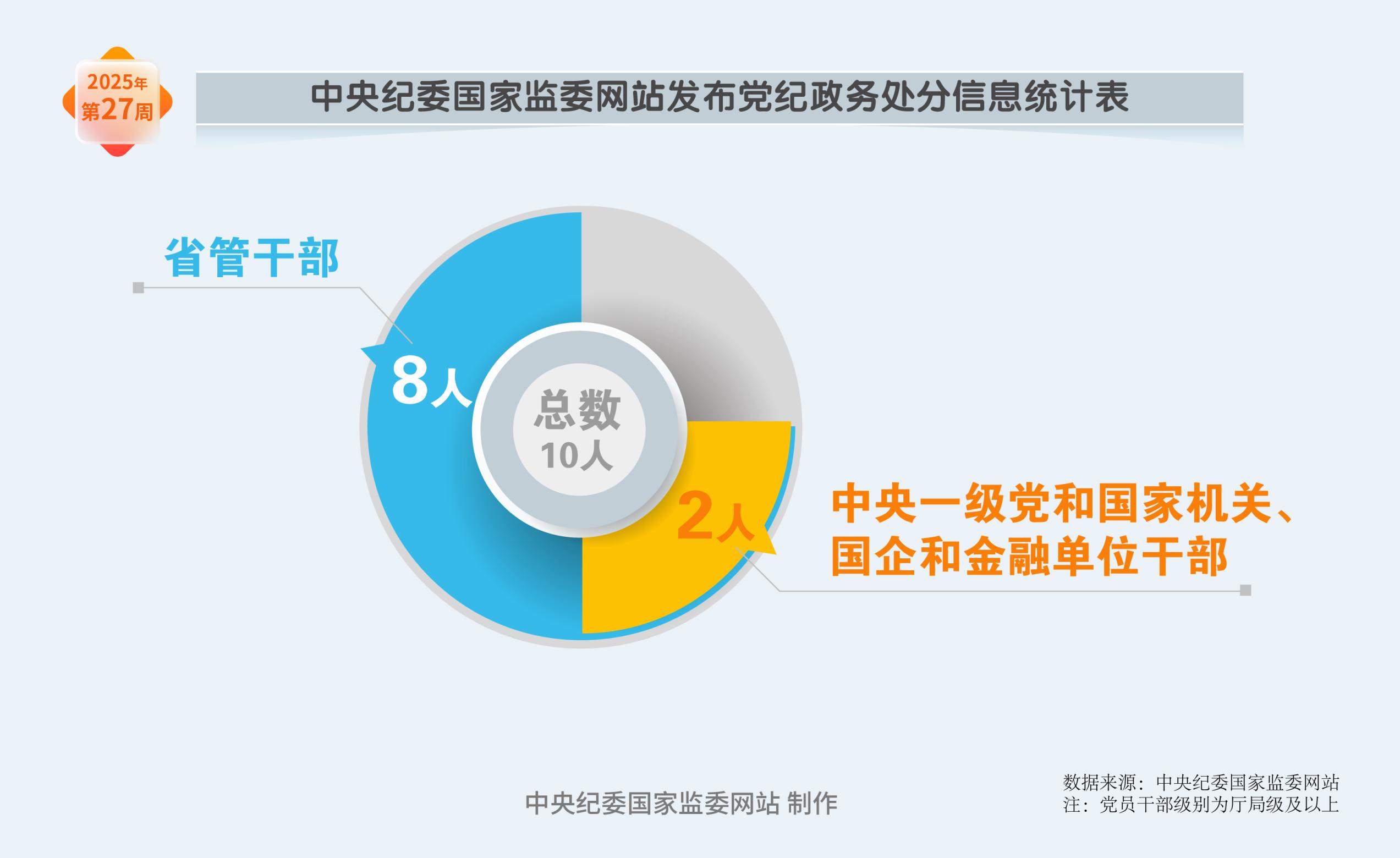 2025年第27周,中央纪委国家监委网站共发布10名党员领导干部党纪政务处分信息。其中,中央一级党和国家机关、国企和金融单位干部2人,省管干部8人。