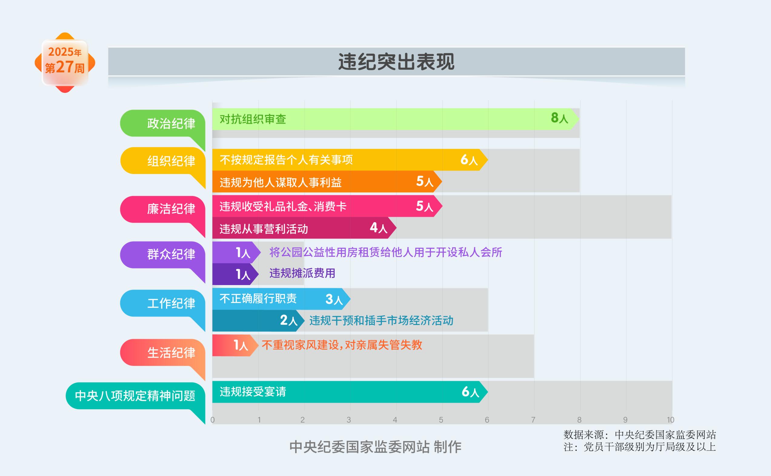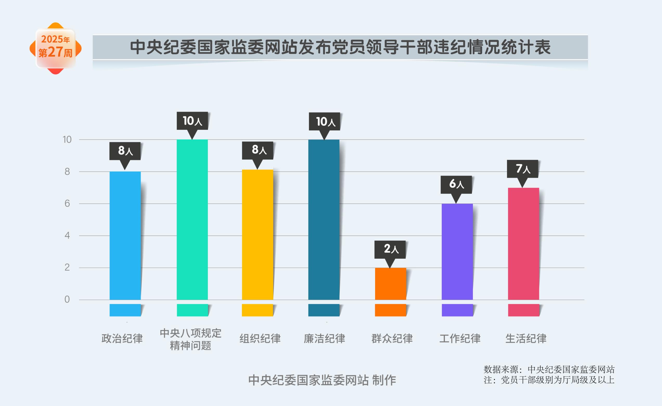 2025年第27周,中央纪委国家监委网站发布的党纪政务处分信息中,10名被处分党员领导干部均存在违反廉洁纪律、违反中央八项规定精神问题,违反政治纪律、违反组织纪律的各8人,2人违反群众纪律,6人违反工作纪律,7人违反生活纪律。