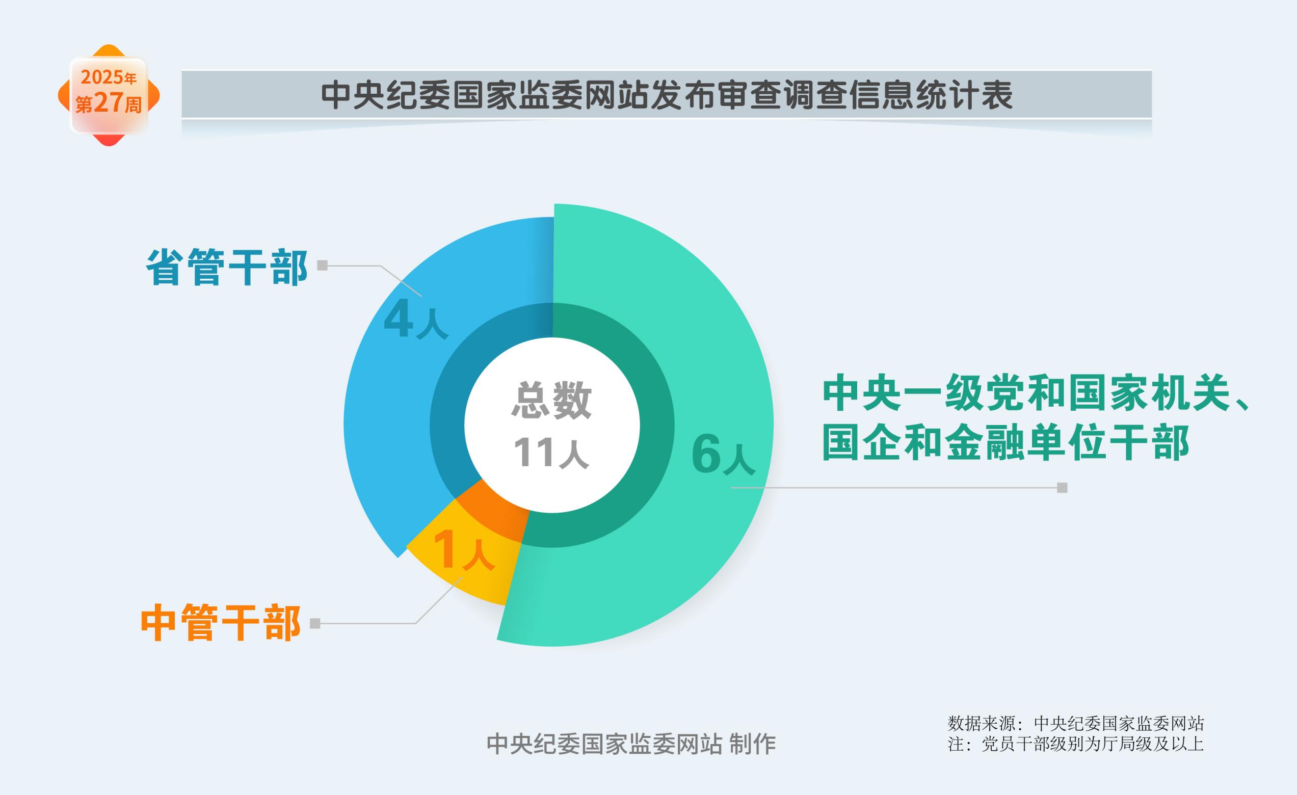 2025年第27周,中央纪委国家监委网站共发布11名党员领导干部接受审查调查信息。其中,中管干部1人,中央一级党和国家机关、国企和金融单位干部6人,省管干部4人。